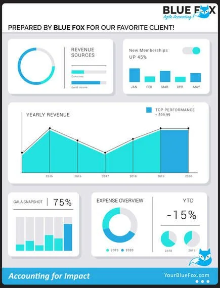 Our team at Blue Fox builds dashboards for clients upon request. Some are more extensive and others are one-page snapshots. Customization is key and no two organizations have exactly the same needs. The common factor is that our clients present interesting, concise, actionable data to their stakeholders to make their board and management meetings truly useful moments.